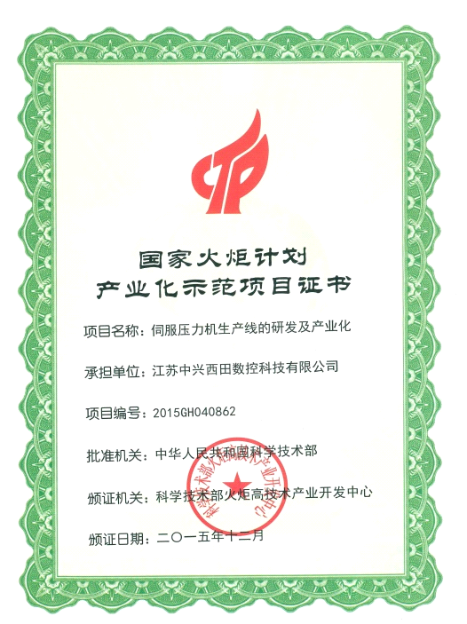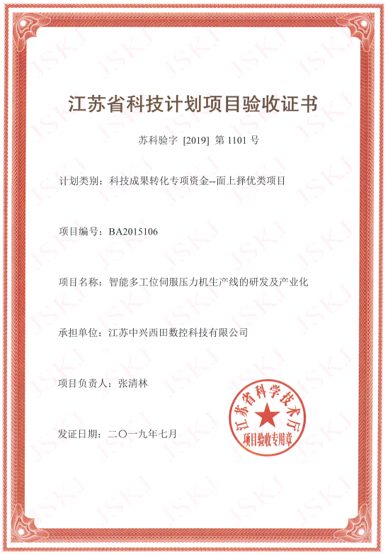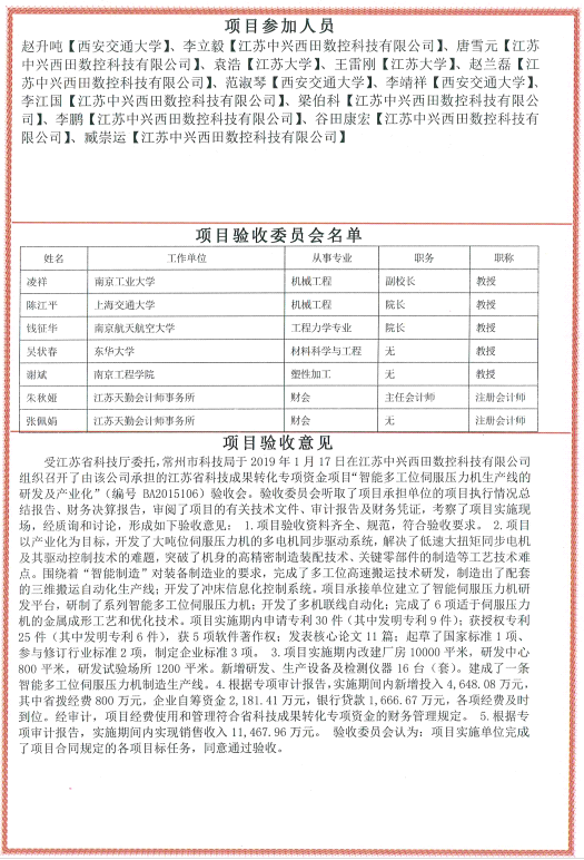 企業(yè)品牌知名度在行業(yè)內(nèi)不斷提升,獲批國家高新技術(shù)企業(yè),建有江蘇省博士后創(chuàng)新實踐基地、江蘇省企業(yè)研究生工作站(優(yōu)秀)、江蘇省智能伺服鍛壓裝備及工藝工程技術(shù)研究中心、江蘇省智能伺服鍛壓裝備系統(tǒng)工程中心、江蘇省工業(yè)企業(yè)技術(shù)中心、江蘇省工業(yè)設計中心,也是國家火炬計劃項目、江蘇省科技成果轉(zhuǎn)化項目承擔單位,是中國鍛壓協(xié)會副理事長單位、江蘇省創(chuàng)新創(chuàng)業(yè)促進會雙創(chuàng)人才分會副會長單位。興鍛產(chǎn)品獲得江蘇省重點推廣應用新技術(shù)新產(chǎn)品,江蘇省首臺(套)重大裝備產(chǎn)品、江蘇省高新技術(shù)產(chǎn)品,江蘇省科學技術(shù)進度三等獎。主持并驗收了江蘇省重大成果轉(zhuǎn)化項目《智能多工位伺服壓力機生產(chǎn)線的研發(fā)及產(chǎn)業(yè)化項目》(BA2015106)、國家火炬計劃示范項目《伺服壓力機生產(chǎn)線的研發(fā)及產(chǎn)業(yè)化》(2015GH040862),江蘇省高端趕超工程項目。清單和證明如下: